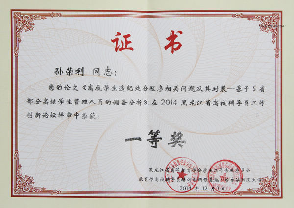 近日,在黑龙江省教育厅学生处组织的全省高校辅导员工作创新论坛论文评比中,学院推荐的公共卫生学院辅导办主任孙荣利的论文《高校学生违纪处分程序相关问题及其对策——基于S省部分高校学生管理人员的调查分析》荣获一等奖,创下了学院在该类评比中的最好成绩。此次活动共评选出一等奖10名,二等奖20名,三等奖27名。