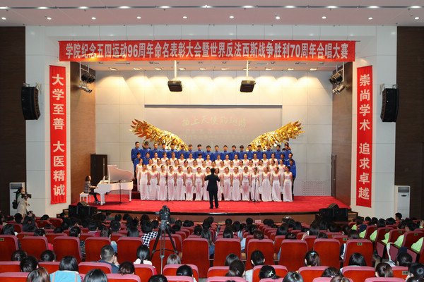 5月4日下午,学院在图书行政楼二楼多功能厅举行了纪念五四运动96周年命名表彰大会暨世界反法西斯战争胜利70周年合唱比赛。学院院长刘吉成、党委副书记崔光成、副院长姜凤楼,各二级学院、附属医院相关领导以及 300余名团员代表参加了本次活动。