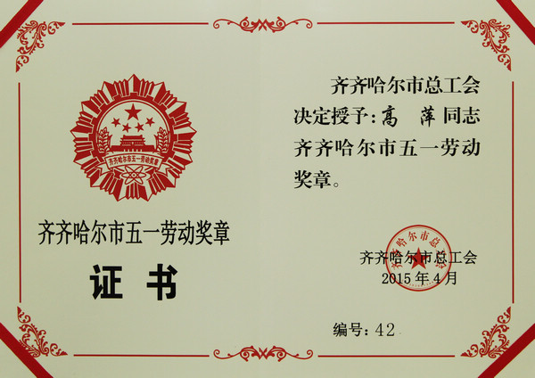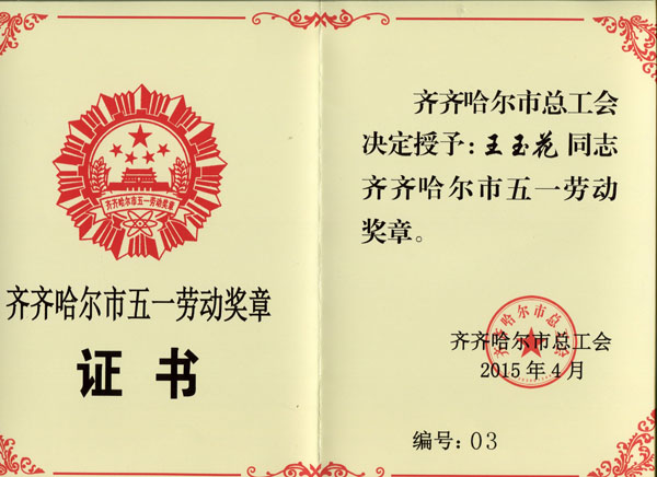 近日获悉,继学院副院长张晓杰、附属二院神经内科主任周洁信荣获市劳动模范之后,学院又有两名同志荣获全市五一劳动奖章。精神卫生学院院长王玉花经过学院基层推荐、评审、公示、市总工会复审等环节,荣获全市“五一劳动奖章”;学院工会副主席高萍与另外10名全市工会干部一起,由齐齐哈尔市总工会推荐荣获“五一劳动奖章”。