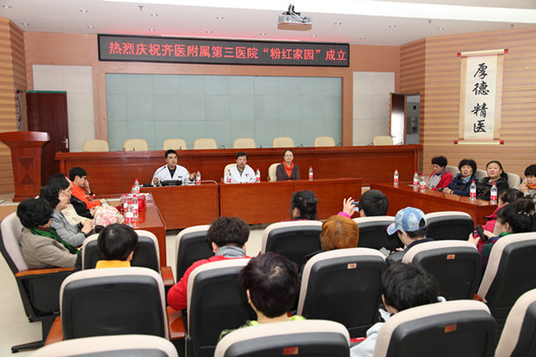 会上,乳腺外科主任李祖彬致开幕词,他希望通过“粉红家园”这样的平台,为患者创造和谐、温暖的康复环境,并祝愿病友们可以重拾信心,积极面对生活。随后,长春市肿瘤医院专家杨晓黎教授、附属三院乳腺外科张延勇医生、赵月生医生分别以《自体免疫细胞概述及对肿瘤治疗的临床应用》、《如何防治乳腺癌》、《乳腺癌的内分泌治疗》为题作了讲座。讲座中,专家们围绕着相关专业对乳腺疾病的治疗、国内外最新治疗方法及治疗效果等进行了讲解,并对病友提出的问题一一作答。活动中,乳腺科医护人员还为28位病友进行了淋巴细胞亚群免费检测,并为到会病友及家属免费发放了书籍《关爱乳房——献给女性的爱》。