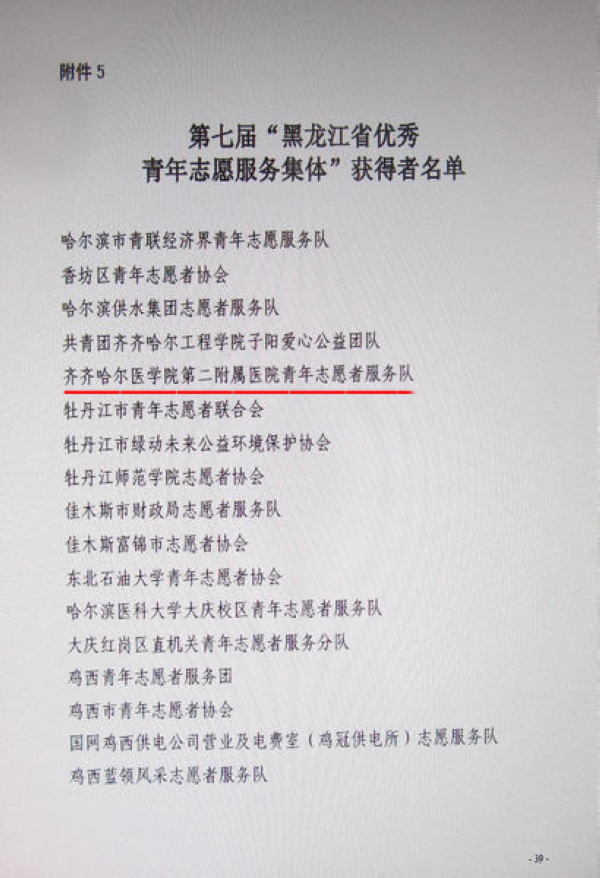 近日,团省委下发了《关于表彰省级青年文明号、青年志愿者先进集体和个人、青年创业奖的决定》,附属二院青年志愿者服务队被授予第七届“黑龙江省优秀青年志愿服务集体”。