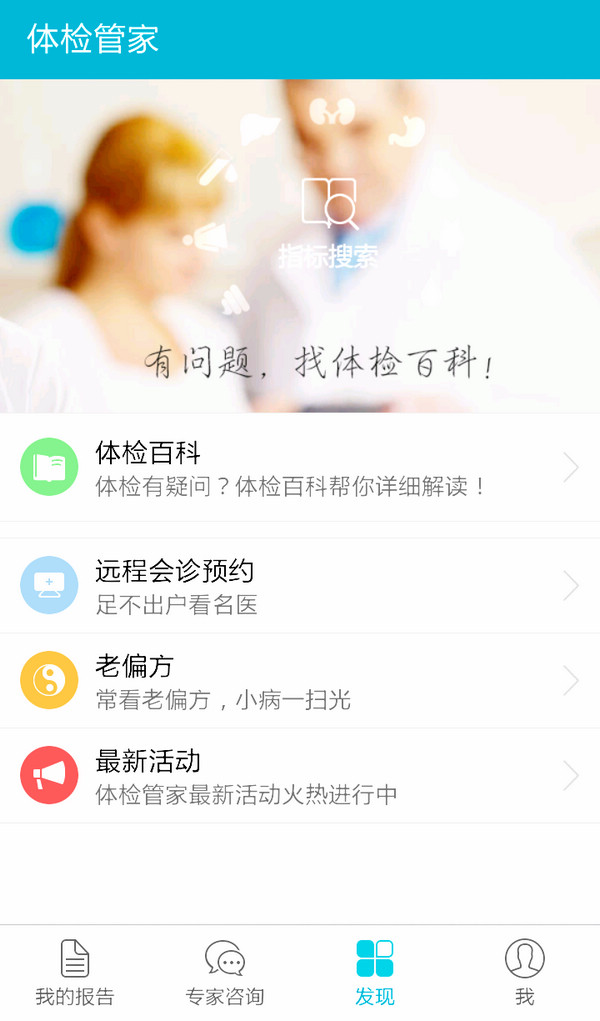 “掌上体检管家”是一款基于智能手机的免费健康类应用软件,提供手机体检报告查看、免费专家咨询、全面体检解读、管理一生体检报告、远程会诊预约等健康服务。此款应用软件节省了体检者亲自到医院领取报告结果这一步骤,体检者可通过实时查看自己的检查报告单,与以前的体检检查结果进行综合对比,清楚直观地了解自己的健康状况。如有疑问,还可向附属一院体检中心医务人员咨询,24小时之内得到答复。同时提供了普及医学知识和健康常识的平台,帮助大家轻松读懂体检报告,真正实现了“我的健康我做主”的目标。