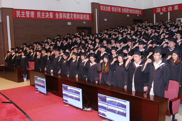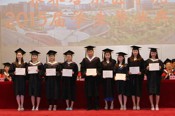 毕业典礼上, 2015届普招毕业生、优秀毕业生代表分别上台领取毕业证书、学位证书和优秀毕业生证书。典礼还对考取“985”“211”院校及发达国家名牌高校研究生的57名学生进行了表彰奖励。