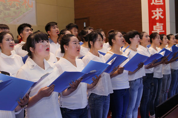 毕业典礼前,杏林合唱团为大家演唱了校歌《插上天使的翅膀》,送上了他们对学哥学姐们的祝福和期盼。随后,毕业典礼正式开始,全场起立奏国歌。在团委书记马倩的带领下,全体毕业生重温医学生誓言,立志“竭尽全力除人类之病痛,助健康之完美,维护医术的圣洁和荣誉。救死扶伤,不辞艰辛,执着追求,为祖国医药卫生事业的发展和人类身心健康奋斗终生!”