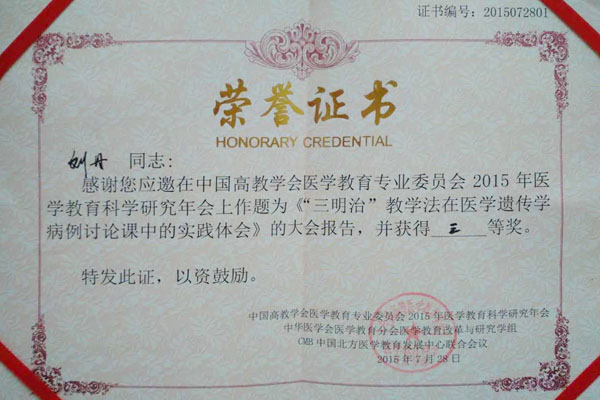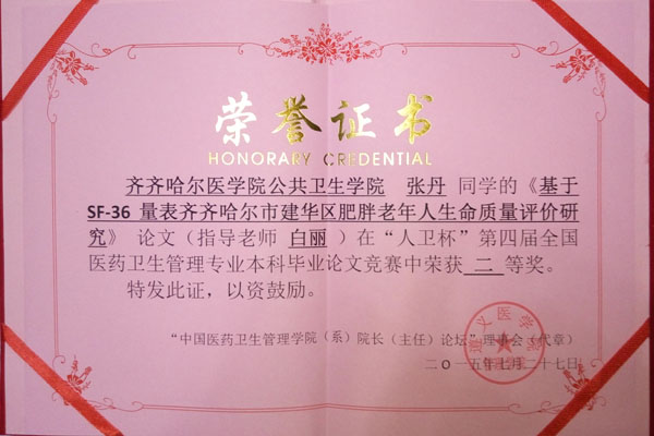 本次大会还进行了第四届全国医药卫生管理专业论文评比,复旦大学、华中科技大学、山东大学、武汉大学等78所高校卫生管理专业的234篇本科学生毕业论文参加了评比。学院公共卫生学院2011级管理专业张丹同学荣获二等奖;同时学院4篇教师论文参加大会交流,经过现场评审,基础医学院刘丹老师的论文《“三明治”教学法在医学遗传学病例讨论课中的实践体会》荣获三等奖。
