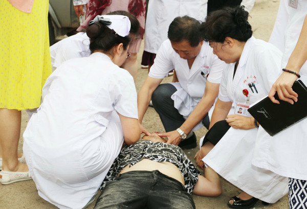恰巧医院院长张淑英、党委书记丁国旭带领医院安全检查组一行30余人经过那里,看到前面不远的路上躺着一个人,又听到女孩的呼救声,大家立即飞奔过去,将俯卧在地面上的病人翻转过来,发现病人是个50多岁的女性,面色青紫,口角流血,眼球固定,脸上沾满了泥土和血迹,小便失禁,呼吸及大动脉搏动消失,根据病人的症状和体征,张淑英院长、张忠太副院长等当即诊断为心脏骤停、猝死。针对病人的特殊情况,张淑英院长等迅速组织大家为病人实施了心肺复苏术等院前急救,并马上开通了生命救治绿色通道,通知急诊科和ICU携带抢救设备立即到现场实施救治。