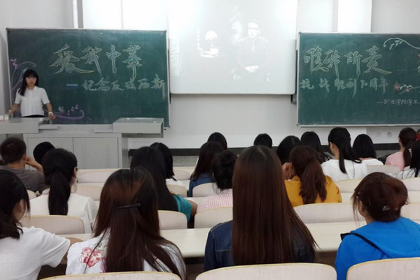 今年是中国人民抗日战争暨世界反法西斯战争胜利70周年。为了使学院广大师生深刻接受爱国主义教育和革命传统教育,铭记历史、缅怀先烈,珍爱和平、开创未来,传承弘扬伟大的抗战精神,积极培育和践行社会主义核心价值观,树立崇高理想信念,团委和各二级学院纷纷开展各类主题活动,纪念中国人民及世界人民获得的伟大胜利。