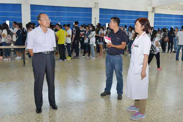 6日上午,学院党委书记邱福利、院长刘吉成、党委副书记崔光成等先后到迎新现场看望前来报到的新生及家长,慰问参与迎新工作的师生,检查迎新工作开展情况。“同学你家是哪儿的啊?” “来到齐齐哈尔还适应么,累不累?”“有没有遇到什么困难?”……邱福利书记和刘吉成院长依次走到各个学院迎新接待站前,热情地和新生及家长交流,介绍学校的发展建设和文化氛围,了解新生的生源信息、专业选择、气候适应等情况,勉励学子们在即将开始的大学生活里,刻苦学习,勤于钻研,成长为优秀的“白衣天使”。同时,邱福利书记和刘吉成院长还亲切慰问了参与迎新工作的师生,向他们的无私付出和辛勤劳动表达感谢和敬意。
