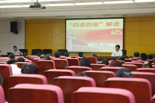 讲座过程中,杨俊全副教授向与会人员介绍了“四进四信”的由来及重要意义,习近平总书记系列讲话精神的重点内容,并详细阐述了如何推进习近平总书记系列讲话精神“进支部”活动。他强调,“进支部”关键要从开展支部书记培训、纳入支部组织生活、强化日常学习教育、抓好学习督促检查入手。讲座后,与会人员表示,通过此次培训对“四进四信”有了更为全面深刻的理解,并对如何推进习近平总书记系列讲话精神“进支部”有了更深刻的认识,对他们今后开展此项工作具有很强的指导意义。
