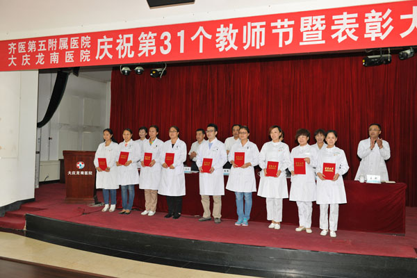 表彰会上,医院党委副书记、纪委书记、工会主席郑国贤宣读了《齐齐哈尔医学院第五附属医院2014-2015学年优秀教研室和优秀教师等的表彰通报》。随后,2014-2015学年优秀教研室代表,最佳教学管理者、优秀教学管理者代表,优秀教师代表,优秀教学秘书、优秀技能培训教师、优秀实习带教、优秀见习带教导师、优秀护理实习带教教师代表分别上台领奖。