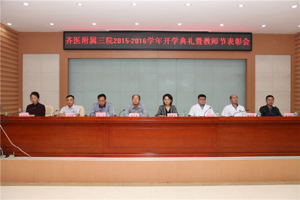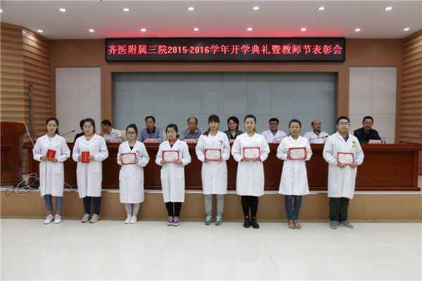 典礼上,医院副院长孙兴元代表医院师生员工,欢迎2012级学生的到来,并介绍了附属三院的历史发展、特色专科、医疗设施、师资队伍等方面的情况,希望大家能以满腔热情投入到学习中去,发扬顽强拼搏刻苦学习的精神,提升自身综合素质,实现新学年的更高跨越。医院纪委书记、工会主席宁景志宣读了《齐医附属三院教学工作奖励办法》;医院副院长孙庆顺宣读了“2014-2015年度寝室文化建设先进集体”的表彰决定;医院副院长李晓华宣读了《关于表彰2014-2015学年教学工作“优秀集体”“优秀个人”的决定》;医院副院长武立刚宣读了《关于表彰2013-2015学年“教学专项奖励”的决定》。