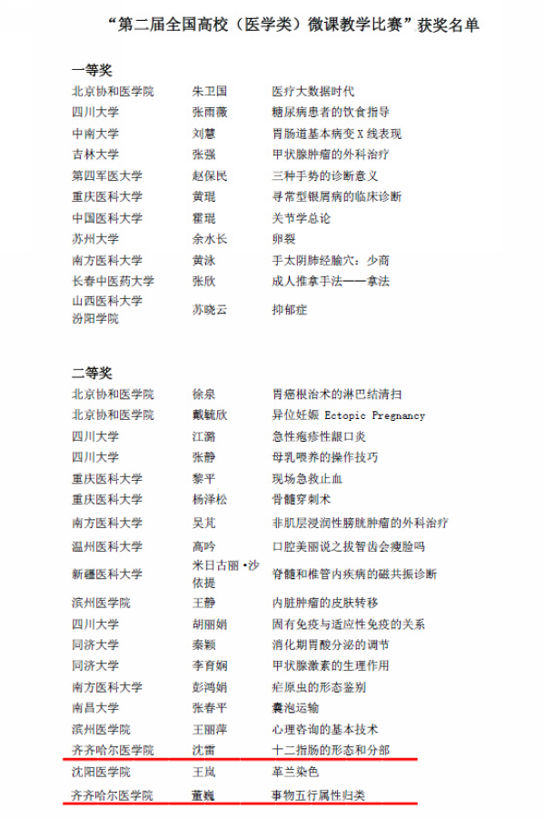 近日,基础医学院教师沈雷的《十二指肠的形态和分布》、药学院教师董巍的《事物五行属性归类》从全国众多参赛作品中脱颖而出,荣获“第二届全国高校(医学类)微课教学比赛”二等奖。同时,沈雷老师的参赛作品还获得了教学设计奖,学院获得了优秀组织奖。