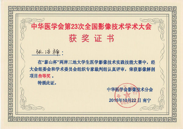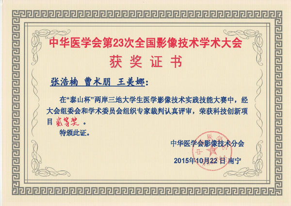 10月16日,“泰山杯”两岸三地大学生医学影像技术实践技能大赛在山东泰安举行。学院3名学生组成的代表队在医学技术学院副院长钱丽丽的带领下参加比赛,荣获大赛团体二等奖、科研创新项目二等奖,张浩楠同学荣获影像解剖项目个人三等奖。