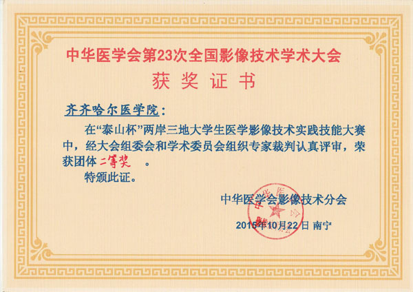 本次大赛由中华医学会影像技术分会主办,泰山医学院承办,香港理工大学、台湾国立阳明大学、陕西中医药大学、大理大学、福建中医药大学等两岸三地的14所高校派队参赛,港台高校为首次派队参加比赛。学院选手不畏强手,沉着应对,充分发扬团队协作精神,凭借扎实的影像技术理论基础和实践技能,取得了优异的比赛成绩,展现了齐医学子的风采。尤其在科研创新项目比赛中,师生前期准备充分、选手现场发挥出色,分数仅次于香港理工大学、泰山医学院、台湾国立阳明大学,位居第4。大赛在泰山医学院和中华医学会影像技术分会网站上同步实时直播,并有多家电视台、新闻网站等媒体跟踪报道。