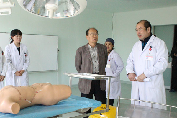在走访各附属医院期间,崔光成副书记还深入学生临床技能实训中心、教室、宿舍、食堂等地,全面了解学生学习、生活情况,并对各附属医院的学生管理工作和临床技能实训中心建设工作给予高度评价,希望各附属医院利用好现有的学生临床技能实训设施做好学生技能培训工作,确保学生实习效果,同时要加强学生安全教育和管理,不断创新学生教育和管理的方式方法。