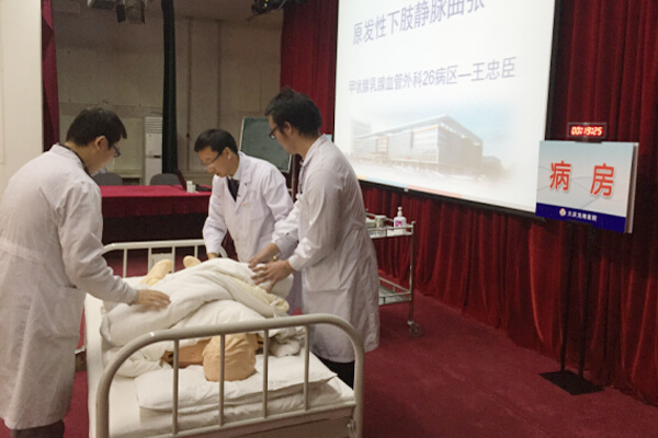 在比赛现场,由参赛选手和1名学生、1名住院医生组成的教学团队进行了临床模拟教学查房,选手首先在模拟示教室介绍查房的教学目地、重点和注意事项等。随后,选手带领团队按顺序进入模拟病房,正确站位后由学生先汇报病史,住院医生补充,由选手对病史进行提问、讲解,再由学生进行体格检查。选手针对体检指出不足,做规范示范和讲解,期间不但要与患者沟通展现人文关怀,还要处处体现爱伤观念、无菌观念。最后,选手带领团队回到示教室进行分析讨论。