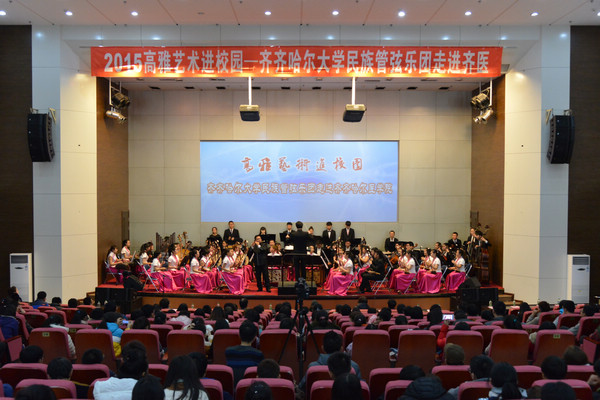 11月17日晚,齐齐哈尔大学民族管弦乐团在齐大宣传部部长王晓梅、副部长何强的带领下走进齐医,为学院 300余名师生献上了一场高水准、高品位的“高雅艺术进校园”专场演出。学院党委副书记崔光成、副院长张晓杰与师生共同观看了演出,宣传统战部部长张宝林致辞,对齐大民族管弦乐团的到来表示热烈欢迎。