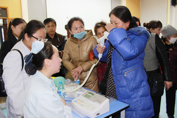 呼吸科主任皮秀杰讲述了世界慢阻肺日的来历以及目的,她用平直的语言讲解了什么是慢阻肺,提出健康的生活方式对于慢阻肺疾病的预防和治疗尤为关键,她倡导全民戒烟限酒,爱护环境,享有健康的生活方式。呼吸科副主任林志国在讲座中介绍了慢阻肺的预防、治疗、康复等医学知识以及注意事项。护士长王玉凤与大家共同探讨了生命的意义和价值,引人深思。呼吸科护士现场为病人、家属及学生讲解、示范呼吸操,会场内200余名观众共同演练。讲座结束后,医护人员还为患者及家属免费进行了肺功能检测,评估肺功能状态。会场内年龄最大的与会者83岁的赵大爷说自己是呼吸科老患者了,深受慢性呼吸疾病的困扰,每次住院都得到附属一院呼吸科的精心治疗,这堂课科普知识丰富,内容浅显易懂,让每位患者都受益匪浅,不虚此行。