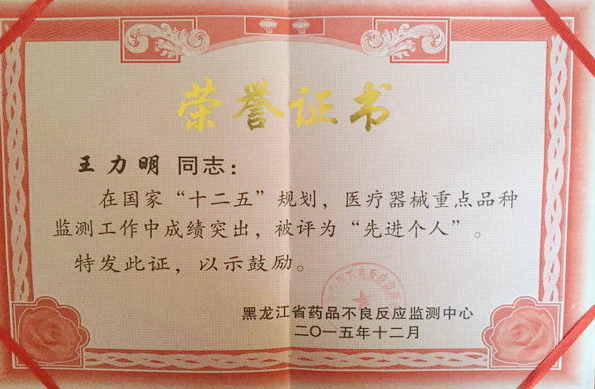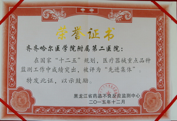 近日,黑龙江省药品不良反应监测中心开展了“十二五”期间医疗器械重点品种监测工作评选活动,附属二院被评为省医疗器械重点品种监测先进集体,设备科工程师王力明被评为先进个人。