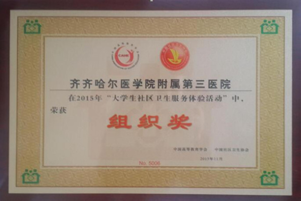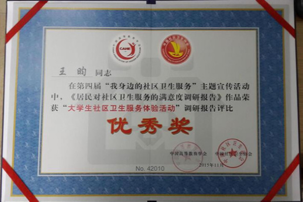 近期,从中国社区卫生协会传来喜讯,附属三院2011级临床1班王昀同学在第四届“我身边的社区卫生服务”主题宣传活动中,获得2015年度“大学生社区卫生服务体验活动”调研报告优秀奖,附属三院荣获组织奖。