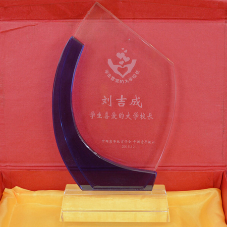 颁奖典礼上,刘吉成院长从身着印有校长“脸萌”帽衫的学生代表手中接过了“学生喜爱的大学校长”奖杯和奖状,学生李羚仪还代表齐医全体学生向刘吉成院长赠送了别具特色的礼物。刘吉成院长曾无数次为学生颁过奖,但这还是他头一次体验到学生为自己颁奖的欣慰与幸福。他发表了热情洋溢的获奖感言,他说:“校长心中会装有许许多多的事情,会装有大师,会装有大楼,会装有学术,会装有科研,但无论心中千有万有,惟一不能没有的就是学生。作为医学院校的校长,不仅要为我们的医学生洞开一扇通往科学大道的大门,还要培养学生对至高无上生命价值的尊重,对生活的热爱,对国家的热爱,对民族的热爱,对职业的热爱。能够获得‘学生喜爱的大学校长’这样的称号,是对我从事医学教育工作最大的心灵慰藉。”刘吉成院长的发言,博得了现场各高校校长及师生的热烈掌声。