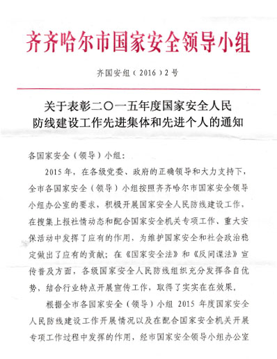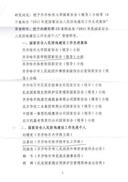 近日,从齐齐哈尔市2016年国家安全人民防线建设工作会议获悉,齐齐哈尔医学院国家安全(领导)小组被评为2015年度国家安全人民防线建设工作先进集体,学生工作部部长丛喜权荣获先进个人荣誉称号。