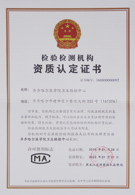 近日,黑龙江省质量技术监督局依据《实验室资质认定评审准则》、《食品检验检测机构资质认定评审准则》及评审专家组现场评审情况,向学院卫生检验中心核发了《检验检测机构资质认定证书(CMA)》,有效期为6年。同时,批准中心检验检测范围包括食品类检测项目164项,非食品类检测指标80项,共计244项检测。这标志着学院卫生检验中心已具备独立承担检验检测能力范围内的检测业务,可以向社会出具具有法律效力的检测数据和结果。