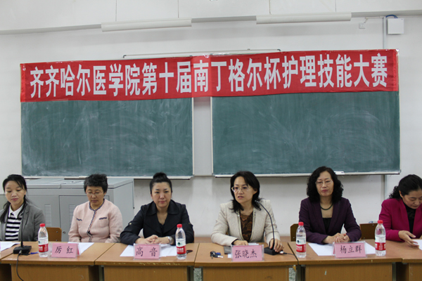 决赛前举行了简短的开幕式,学院副院长张晓杰出席并讲话。实验实训中心主任高音、副主任付桂华、护理学院院长杨立群、党总支书记厉红、副院长李强、王秀清以及评委教师和全部参赛选手参加了开幕式,全体学生庄严宣读了南丁格尔誓言。