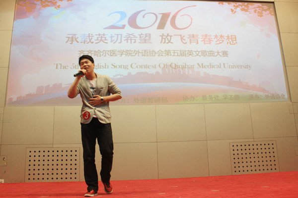 5月25日,“承载英切希望,放飞青春梦想”齐齐哈尔医学院第五届英文歌曲大赛在多功能厅激情上演。本次比赛由外语教研部主办,外语协会承办,教务处、学生工作部、参赛选手所在学院的领导和书记出席了此次大赛,外语教研部各教研室主任及外籍教师Christine担任本次比赛评委。