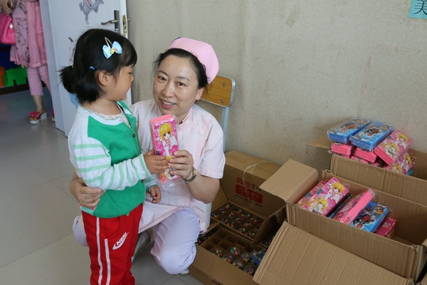 儿科护士长杨春鸿为儿童发放节日礼物
