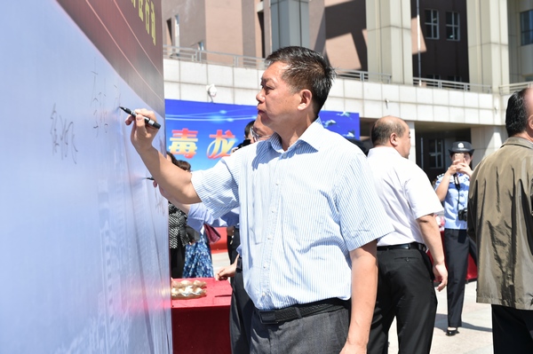 活动期间,禁毒志愿者代表做了拒绝毒品的表态发言,学院学生代表赵仁龙同学宣读倡议书。禁毒委成员单位领导、学院领导和同学们在签字墙上签字,参观仿真毒品、宣传图片展。