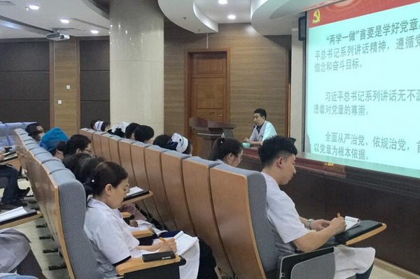 黄海涛书记以《学习党章党规 提高党性修养》为题,从党章在党的生活中的重要地位、学习党章党规的目的、十八大修改党章的背景、十八大党章修改的主要内容、党章的学习方法五方面进行了深入浅出的讲解。讲座指出,开展“两学一做”学习教育,基础在学、关键在做,最终要落实在“做合格党员”上,学习党章党规目的就在于此,优秀合格的党员应当具有尊崇党章、坚定信念、忠诚组织、有担当、遵守党纪的良好品德;要将所学应用于实际,实践出真知,优秀的党员医务工作者在工作生活中要端正做事态度,勇于担当作为;要将“两学一做”贯彻落实,将“一做”作为为患者服务的常态,急患者之所急,想患者之所想,为医院的发展做出自己的贡献。