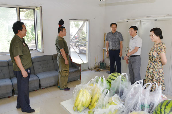 8月19日,学院工会主席何宪坤带领副主席高萍及工作人员,在后勤管理处处长徐辉的陪同下,深入基层,看望并慰问暑假期间一直工作在一线的后勤管理处各个班组、门卫、车队的工人们,为他们购买了几百斤的时令水果,在炎热的夏季给他们带去一丝凉爽,让一线工人们深切感到组织的关怀与温暖。