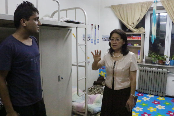 张晓杰副院长检查学生归寝情况时与留学生交流