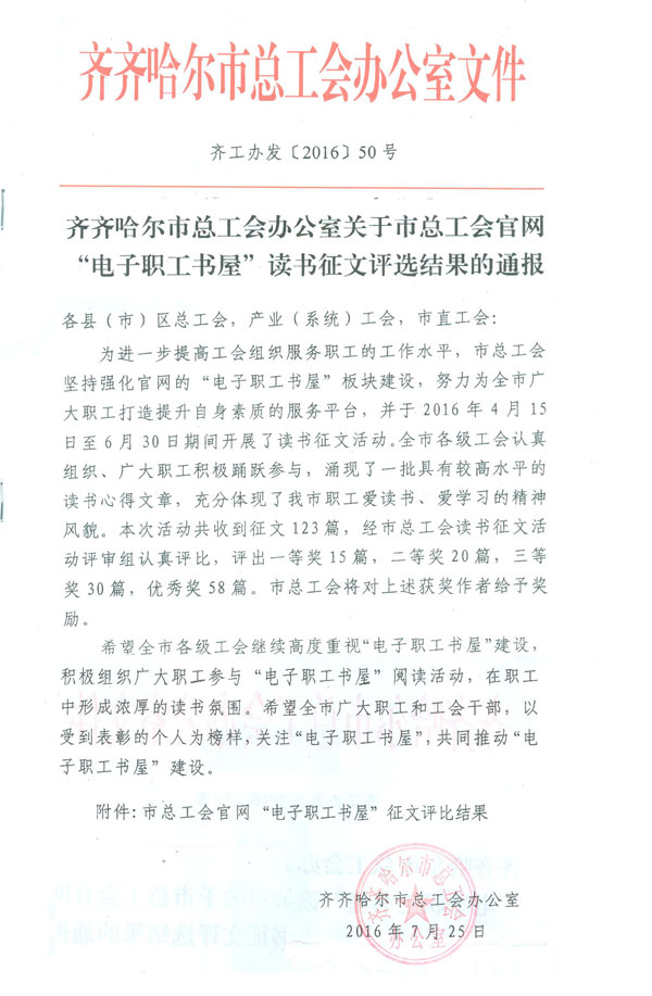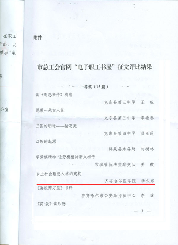 近日获悉,在市总工会官网举办的全市“电子职工书屋”读书征文活动中,学院职工李久东撰写的《乡土社会理想人格的构建》荣获一等奖。为进一步提高全市广大职工素质,积极倡导全民阅读,市总工会于今年4月15日至6月30日,开展了读书征文活动。本次活动共收到征文123篇,评出一等奖15篇,二等奖20篇,三等奖30篇,优秀奖58篇。李久东凭借良好的个人文学素养和深厚的语言文字能力,在此次征文活动中荣获一等奖。(工会2016年8月31日供稿)