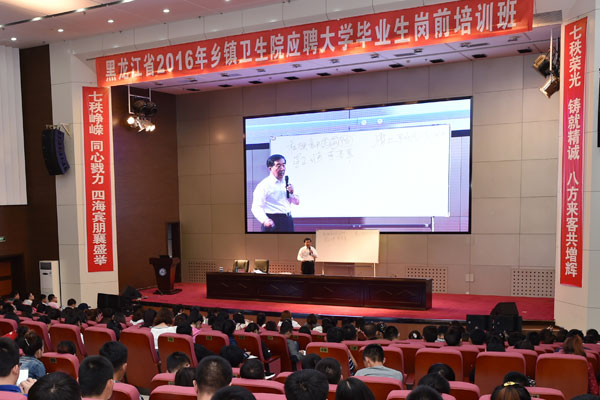 9月9日上午,黑龙江省2016年乡镇卫生院应聘大学毕业生岗前培训班开幕式在学院图书行政楼二楼多功能厅举行。黑龙江省卫生计生委党组成员、副主任、省中医药管理局局长王学军,省卫生计生委基层卫生处处长王永江,学院院长刘吉成、副院长张晓杰,成人与继续教育学院院长罗庆东,全省13个地市、县区卫生计生委的107 名主管领导及来自全国90余所高校新招聘的941名大学毕业生参加了开幕式。开幕式由学院副院长张晓杰主持。