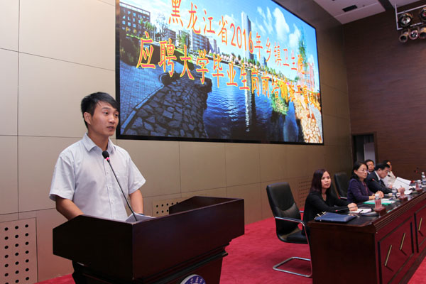 会上,哈尔滨市南岗区王岗镇中心卫生院王格格代表2014年招聘的大学毕业生,结合自己在基层医疗卫生单位两年来工作的实践经验,向各位学弟学妹们提出了不辜负党和政府给大家提供的良好平台,珍惜这次难得的机遇,努力充实自己,扎扎实实,无怨无悔地投入到崇高而平凡的乡镇医疗卫生事业中,做一个守护人民健康的忠实卫士,让青春的烈焰在扎根基层中永远绽放燃烧的祝福和希望。2016年新招聘的即将到双鸭山市饶河县四排乡卫生院的关玉龙作了《青春无怨,奉献无悔》的表态发言。