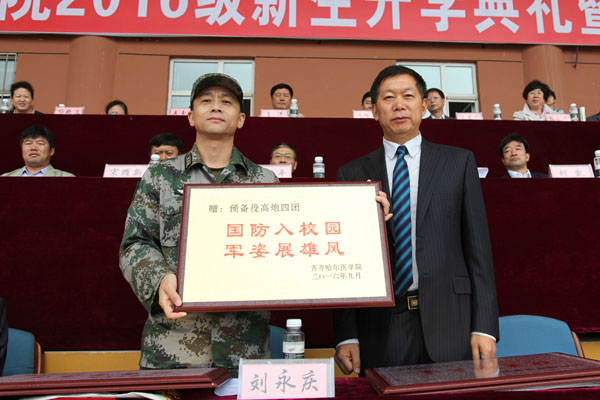 学院院长刘吉成向承训部队赠送牌匾