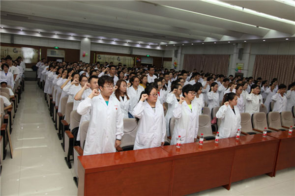 表彰结束后,2012级、2013级学生代表和教师代表分别发言,全体新生进行了医学生誓言宣誓。学院党委副书记崔光成教授在会上作总结发言,他希望同学们养成独立的人格,敢于质疑和挑战;学会包容和欣赏,懂得尊重别人,理解别人的情感,学会与人沟通;登高望远,立志成才;脚踏实地,虚心求知。