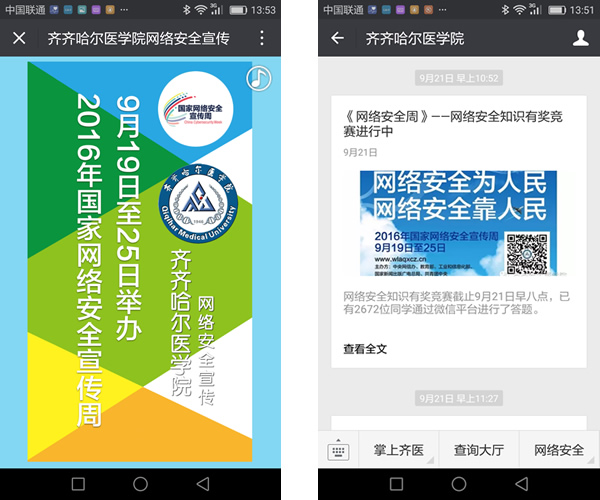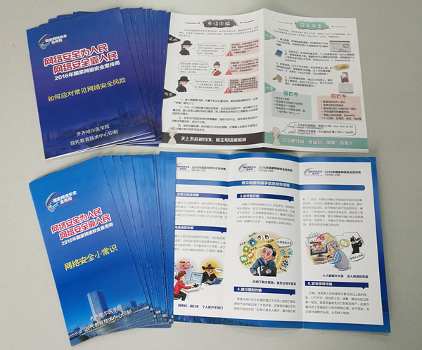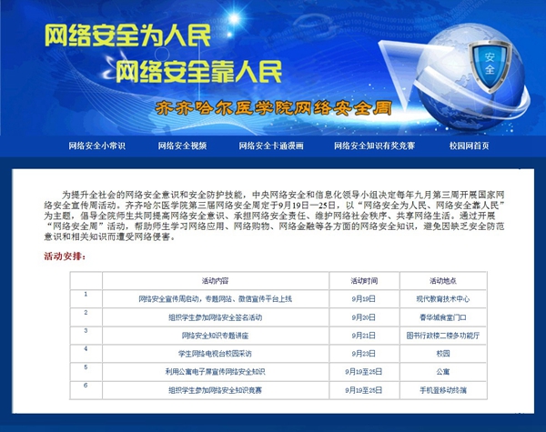 活动周期间,现代教育技术中心在线上建立了网络安全周宣传专题网站,设有网络安全小常识、网络安全视频、网络安全卡通漫画、网络安全知识有奖竞赛等栏目;官方微信平台上制作了网络安全知识微场景;利用微信平台进行网络安全知识有奖竞赛,学生通过扫描二维码即可参与竞赛,截至9月25日晚7点,已有3299人通过微信平台进行答题竞赛。线下系列活动也是丰富多彩。印制了两种网络安全知识宣传折页,发放给广大师生;在春华城门前举办了网络安全知识宣传及签名活动,宣传安全上网、文明上网理念;在学生公寓电子屏上反复播放网络安全相关视频;组织开展网络安全知识进课堂活动,邀请齐齐哈尔市网安支队姚锐副队长为学生作了题为《网络信息安全》的专题讲座,介绍了防止传播网络谣言、预防网络诈骗等知识,深受学生欢迎。活动期间,学生电视台多次开展校园采访活动,进行深入报道。