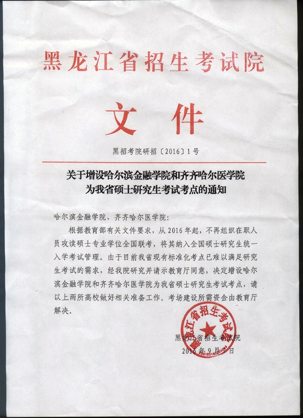 经黑龙江省招生考试院研究批准,学院从2016年起,成为黑龙江省硕士研究生招生考试考点。