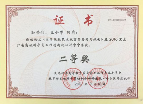 近日,教育部高校辅导员培训和研修基地(哈尔滨师范大学)组织的2016年度全省高校辅导员工作创新论坛论文评比结果揭晓,学院推荐的药学院辅导办主任孙荣利的论文《医学院校艺术教育的思考与探索》荣获二等奖,公共卫生学院辅导办主任梁玉清的论文《医学生人文素质教育现状调查与对策研究》和附属第五医院临床医学教学部吴芳老师的论文《“五心”工作创新学生管理》获得优秀奖。