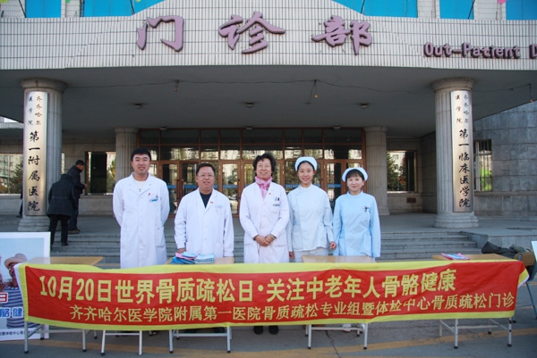 10月20日是世界骨质疏松日,为提高广大群众对骨质疏松的认识,当日上午,附属一院体检中心主任扈瑄、骨质疏松科副主任朱佩文等5名医务人员在医院门诊楼前进行了义诊宣传活动。