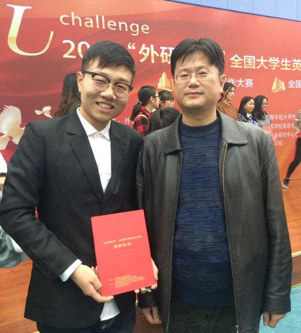 写作大赛二等奖获奖选手周志伟同学与带队老师合影