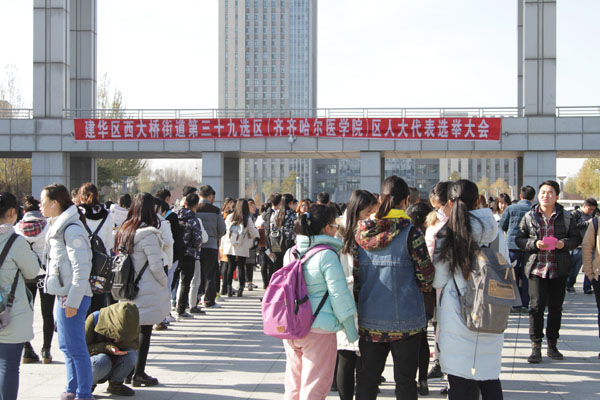 10月27日,阳光和煦、晴空万里。按照建华区人大代表选举工作委员会的统一部署,建华区西大桥街道第三十九选区(齐齐哈尔医学院)近七千名师生选民郑重投票,选举建华区第十七届人民代表大会代表。本次选举,学院登记选民7206人,实际参加投票选民6902人。10月31日,学院选区选举结果通过建华区选举委员会审核,我院张晓杰、肖锋刚同志当选建华区第十七届人民代表大会代表。