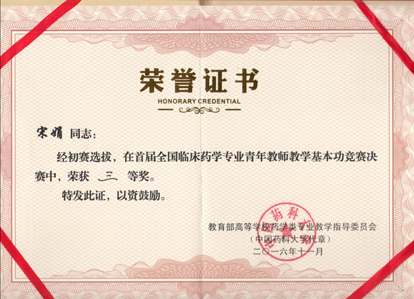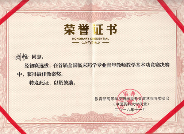 本次大赛决赛由教育部高等学校药学类专业教学指导委员会及中国药学会药学教育专业委员会主办、中国药科大学承办,参赛院校为全国已开设临床药学专业的所有高等院校,竞赛课程限定为《临床药物治疗学》、《临床药理学》、《临床药物动力学》,每个学校最多可选派两名选手参赛,初赛分南、北两个赛区进行。大赛吸引了包括浙江大学、中国药科大学、沈阳药科大学、复旦大学、吉林大学、山东大学等30余所高校的40余名教师参赛,学院选派了《药物治疗学》主讲教师宋娟、《临床药物代谢动力学》主讲教师刘畅参赛。在7月22日于哈尔滨医科大学举行的北部赛区的初赛中,两位教师在18位参赛选手中脱颖而出,顺利闯进前六名晋级决赛。在整个赛事的备战过程中,药学院领导、相关课程专家及有全国青年教师教学基本功大赛经验的教师给予了大力支持,他们进行了多轮听课并提出了宝贵的意见及建议,最终两位教师凭借出色表现获得殊荣。