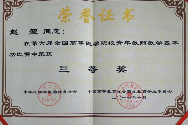 近日获悉,基础医学院青年教师赵堃在第六届全国医学(药学)青年教师教学基本功比赛中荣获三等奖。