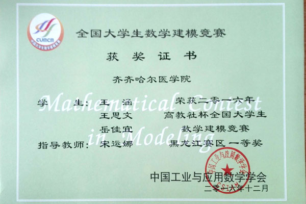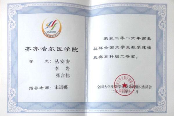 全国大学生数学建模竞赛创办于1992年,每年一届,目前已成为全国高校规模最大的基础性学科竞赛,也是世界上规模最大的数学建模竞赛。今年9月,在基础医学院数学教研室宋运娜老师的指导下,学院30名学生组成10支队伍参加了比赛,并获得多个奖项。通过比赛开拓了学生的视野,增强了学生的逻辑思维和学习运用数理知识的能力,培养了他们的团队协作意识和创新精神。