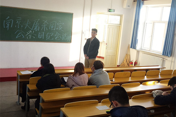 活动中,姜志丹老师为同学们详细介绍了南京大屠杀死难者国家公祭日的由来和南京大屠杀的历史。残酷的真相缓缓呈现在眼前,同学们深受触动,纷纷发言,表达了对遇难同胞的沉痛悼念,对在战争中为国捐躯的烈士们的崇敬与怀念,阐述了在和平年代,更要以史为鉴,承担起当代大学生的历史使命。学生科科长崔颖作总结发言,她号召同学们铭记历史、勤思多学、奋发图强,要活在当下、理性爱国,把满腔的爱国热情化作奋发向上的学习动力。