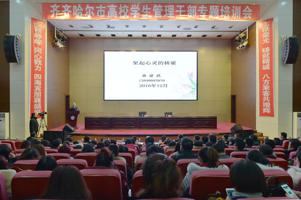 12月22日,全国辅导员年度人物、正厅级巡视员、二级教授、博士生导师曲建武教授应邀来齐,在学院图书行政楼二楼多功能厅为全市高校辅导员作了《架起心灵的桥梁》专题报告。学院党委副书记崔光成、齐齐哈尔大学学生处长姜波、齐齐哈尔高等师范专科学校学工处长王洪江、齐齐哈尔工程学院党委副书记王袚罹,齐齐哈尔理工职业学院院长罗丽等出席报告会,齐市地区五所高校全体辅导员及学生工作管理干部300余人听取报告。报告会由学院学生工作部部长宋耀新主持。